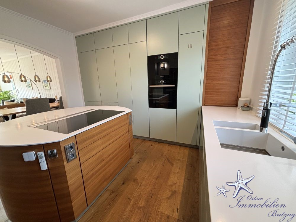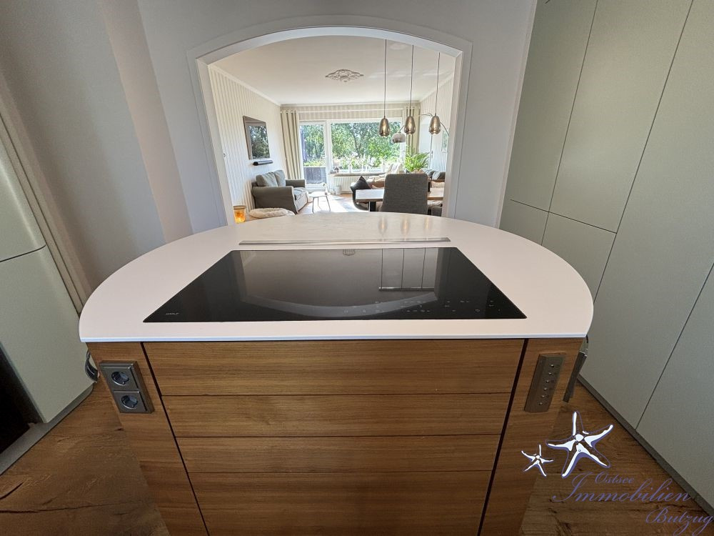 Die hochwertige Designerküche mit drehbarer Insel ist ein absoluter Blickfang und lässt keine Wünsche offen – perfekt für ambitionierte Hobbyköche und gesellige Abende. Direkt daneben befindet sich das modern gestaltete Tageslichtbad im Erdgeschoss mit großer, ebenerdiger Dusche – stilvoll, komfortabel und zeitgemäß.
