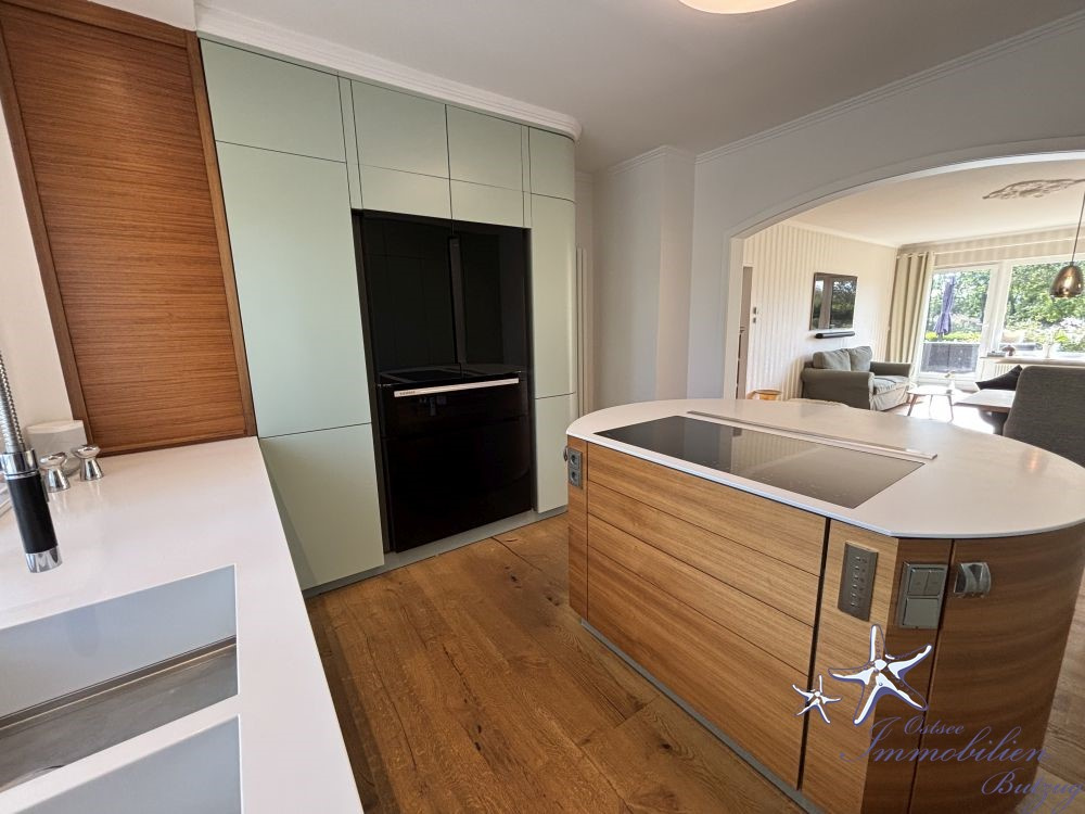 Die hochwertige Designerküche mit drehbarer Insel ist ein absoluter Blickfang und lässt keine Wünsche offen – perfekt für ambitionierte Hobbyköche und gesellige Abende. Direkt daneben befindet sich das modern gestaltete Tageslichtbad im Erdgeschoss mit großer, ebenerdiger Dusche – stilvoll, komfortabel und zeitgemäß.